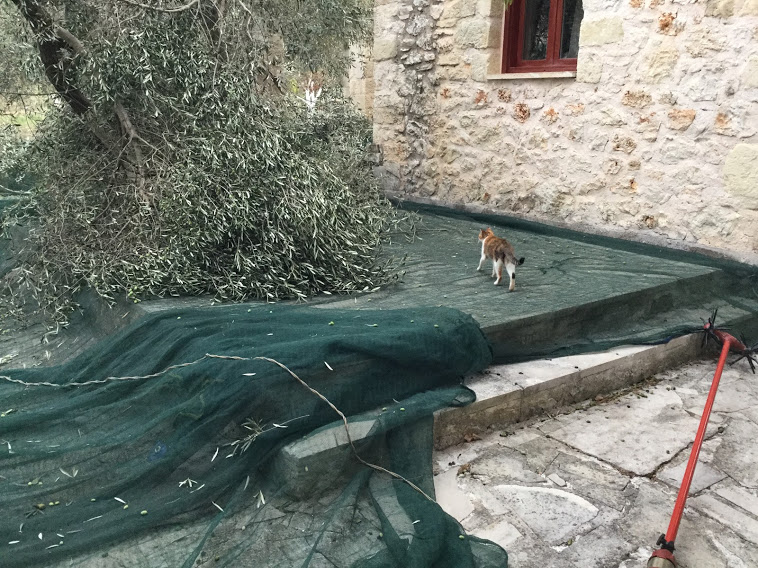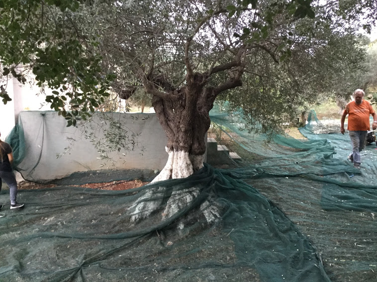 Ymmärrän hyvin, että Espanjassa ja Italiassa, niillä alueilla, missä on tasaista maata, turvaudutaan koneelliseen korjuuseen. Silloin puun alle ajetaan traktorilla ravistin, joka levittää puun alle suppilon. Se on kuin suuri ylösalaisin oleva sateenvarjo, laskostuva. Täällä Kreetalla maan kurvikkaat muodot eivät salli koneiden käyttöä kuin harvassa paikassa, korjuu tapahtuu todella käsin. Espanjassa lasketaan öljylitran korjuukustannusten olevan muutaman sentin, täällä runsaat puoli euroa. MUTTA: käsin korjuu tuo laatua.