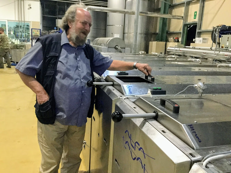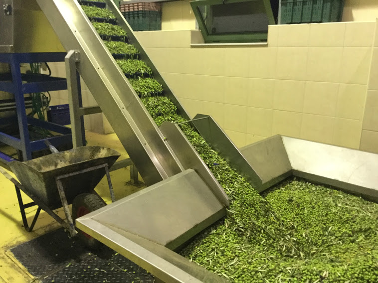 Nikon vuoro tuli aivan ajallaan. Trukki toi säkkejä sisään pienen määrän kerrallaan, pari miestä avasi ne ja tyhjensi siiloon, josta hihna kuljetti ne ensin puhaltimeen. Siinä tuulessa irtoavat oliivinlehdet ja mahdolliset pienet kaarnankappaleet tai risut. Sitä seuraa pesu. Pestyt oliivit nousevat hihnaa pitkin murskaamoon ja siitä vaivaamoon.