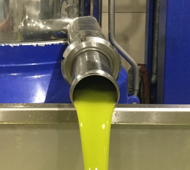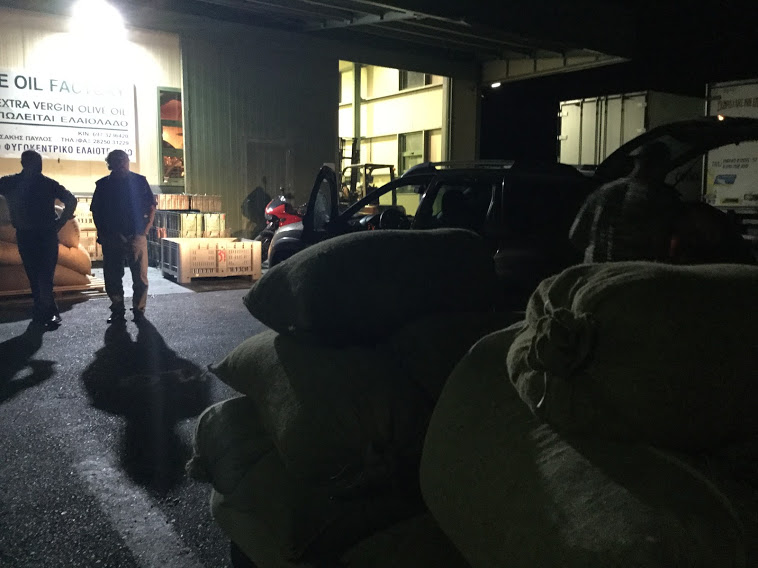 Ilta oli jo pimennyt ja erottamon pihalla kävi kova kuhina. Sisällä loistivat valot, sieltä kuului vaimea tasainen hurina, ovet pihalle olivat selällään ja ovista kulki sekä trukkeja että viljelijöitä. Kulkijoiden varjot piirtyivät valoja vasten, tunnelma oli työteliäs ja odottava. Pihalle saapui vähän väliä ajopelejä, joiden lavalla oli säkkikuormia tai laatikoita täynnä oliiveja. Ne pinottiin pihan laidalla oleviin numeroituihin lavoihin odottamaan vuoroaan. Viljelijät tuntuivat tuntevan toinen toisensa ja he vaihtoivat kuulumisia sadosta ja sen laadusta, odotuksista, säästä ja markkinoista.