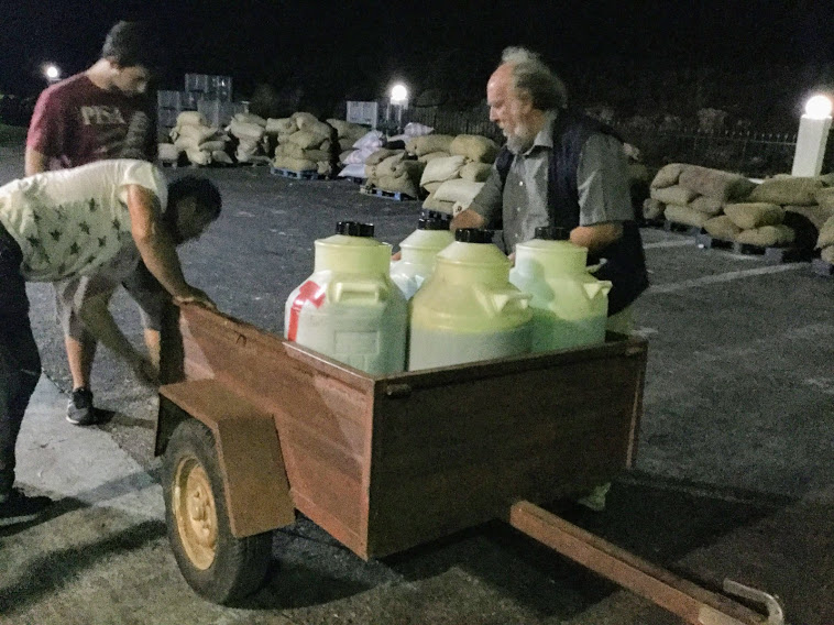 – Sellaiset 45-50 säkkiä olisi normaali määrä, mutta nyt on vain 22 säkkiä. Lasken, että siitä tulisi noin 120 kiloa öljyä – pianpa sen nähdään – lisäsi hän ja lähti kuormansa kanssa kohden oliiviöljyerottamoa, jonne oli varannut ajan. Erottamoiden työstä maksetaan luonnossa, 10 % kustakin erästä.